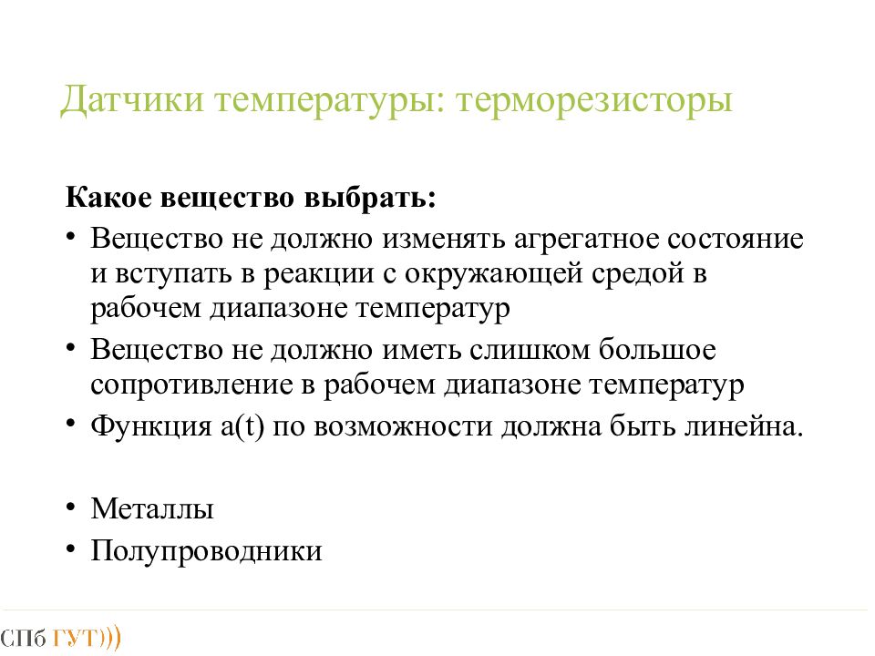 Какое вещество выбрать: Вещество не должно изменять агрегатное состояние и вступать в реакции с окружающей средой в рабочем диапазоне температур Вещество не должно иметь слишком большое сопротивление в рабочем диапазоне температур Функция a(t) по возможности должна быть линейна. Металлы Полупроводники