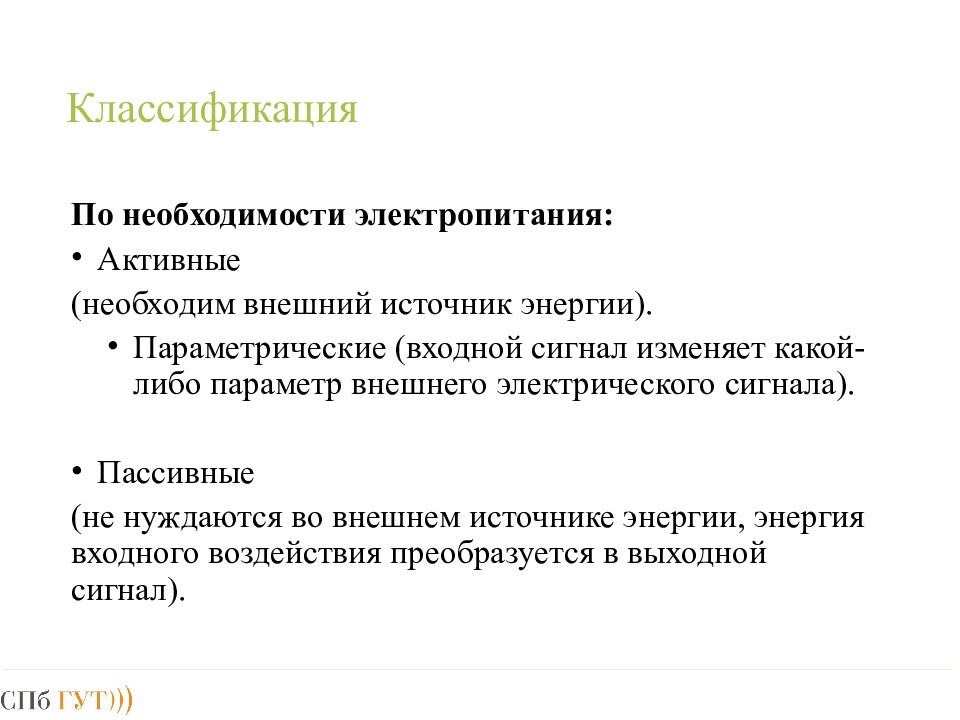 По необходимости электропитания: Активные (необходим внешний источник энергии). Параметрические (входной сигнал изменяет какой-либо параметр внешнего электрического сигнала). Пассивные (не нуждаются во внешнем источнике энергии, энергия входного воздействия преобразуется в выходной сигнал).