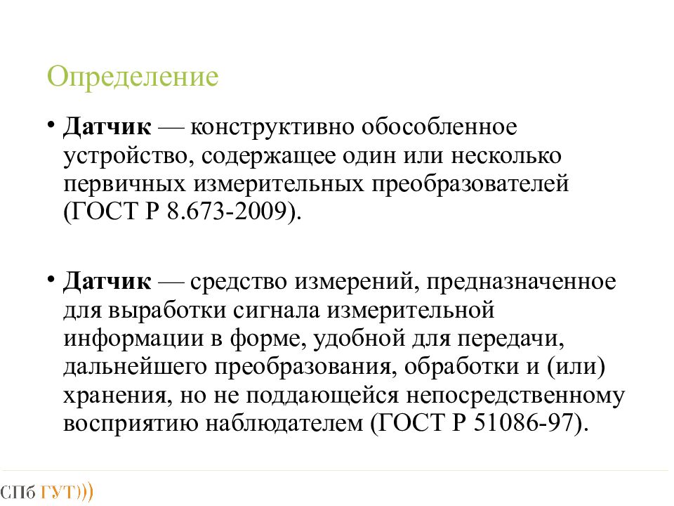 Датчик — конструктивно обособленное устройство, содержащее один или несколько первичных измерительных преобразователей (ГОСТ Р 8.673-2009). Датчик — средство измерений, предназначенное для выработки сигнала измерительной информации в форме, удобной для передачи, дальнейшего преобразования, обработки и (или) хранения, но не поддающейся непосредственному восприятию наблюдателем (ГОСТ Р 51086-97).