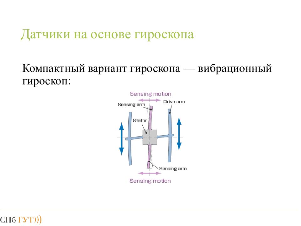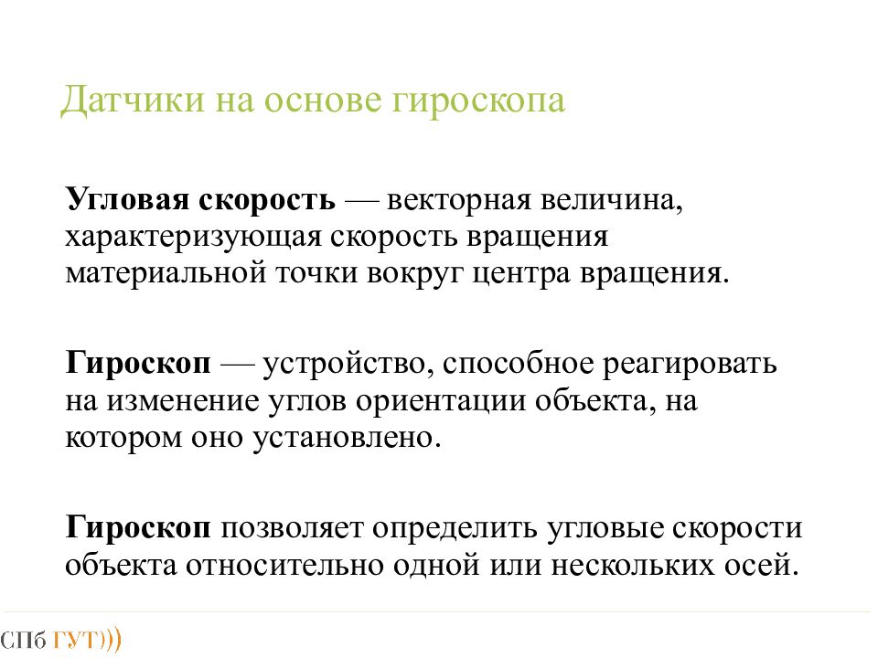 Угловая скорость — векторная величина, характеризующая скорость вращения материальной точки вокруг центра вращения. Гироскоп — устройство, способное реагировать на изменение углов ориентации объекта, на котором оно установлено. Гироскоп позволяет определить угловые скорости объекта относительно одной или нескольких осей.