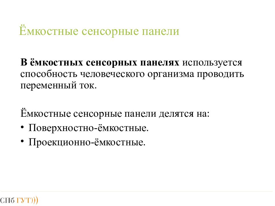 В ёмкостных сенсорных панелях используется способность человеческого организма проводить переменный ток. Ёмкостные сенсорные панели делятся на: Поверхностно-ёмкостные. Проекционно-ёмкостные.