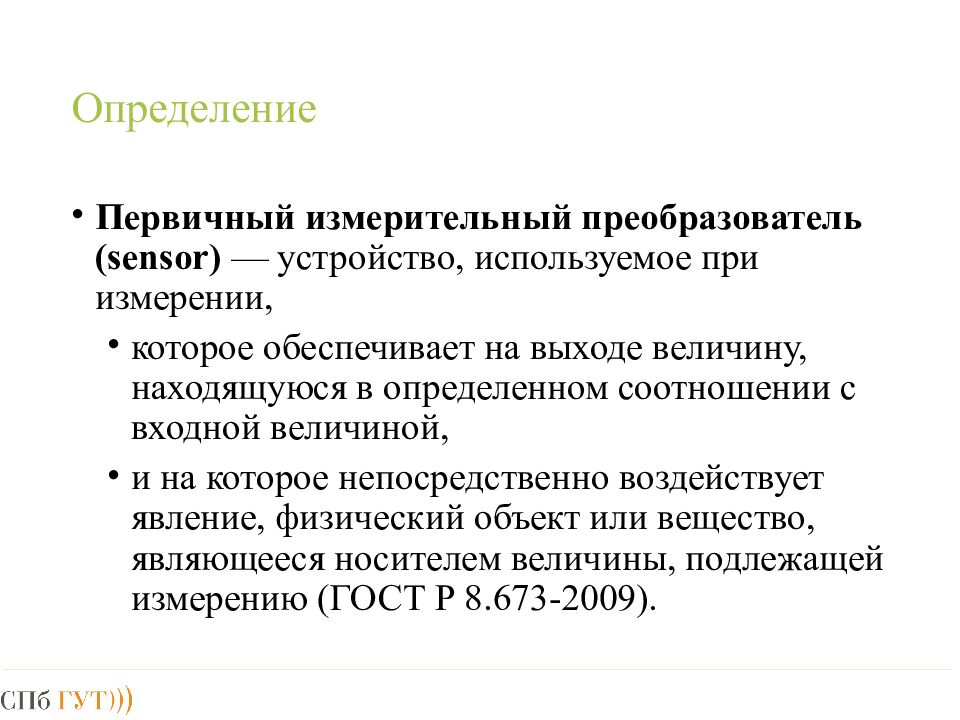 Первичный измерительный преобразователь (sensor) — устройство, используемое при измерении, которое обеспечивает на выходе величину, находящуюся в определенном соотношении с входной величиной, и на которое непосредственно воздействует явление, физический объект или вещество, являющееся носителем величины, подлежащей измерению (ГОСТ Р 8.673-2009).