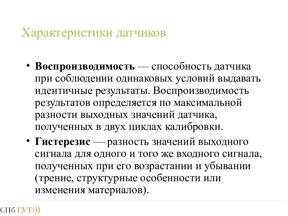Воспроизводимость — способность датчика при соблюдении одинаковых условий выдавать идентичные результаты. Воспроизводимость результатов определяется по максимальной разности выходных значений датчика, полученных в двух циклах калибровки. Гистерезис — разность значений выходного сигнала для одного и того же входного сигнала, полученных при его возрастании и убывании (трение, структурные особенности или изменения материалов).