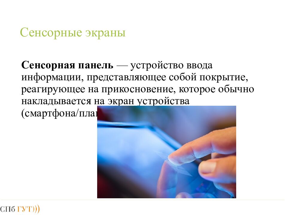Сенсорная панель — устройство ввода информации, представляющее собой покрытие, реагирующее на прикосновение, которое обычно накладывается на экран устройства (смартфона/планшета).
