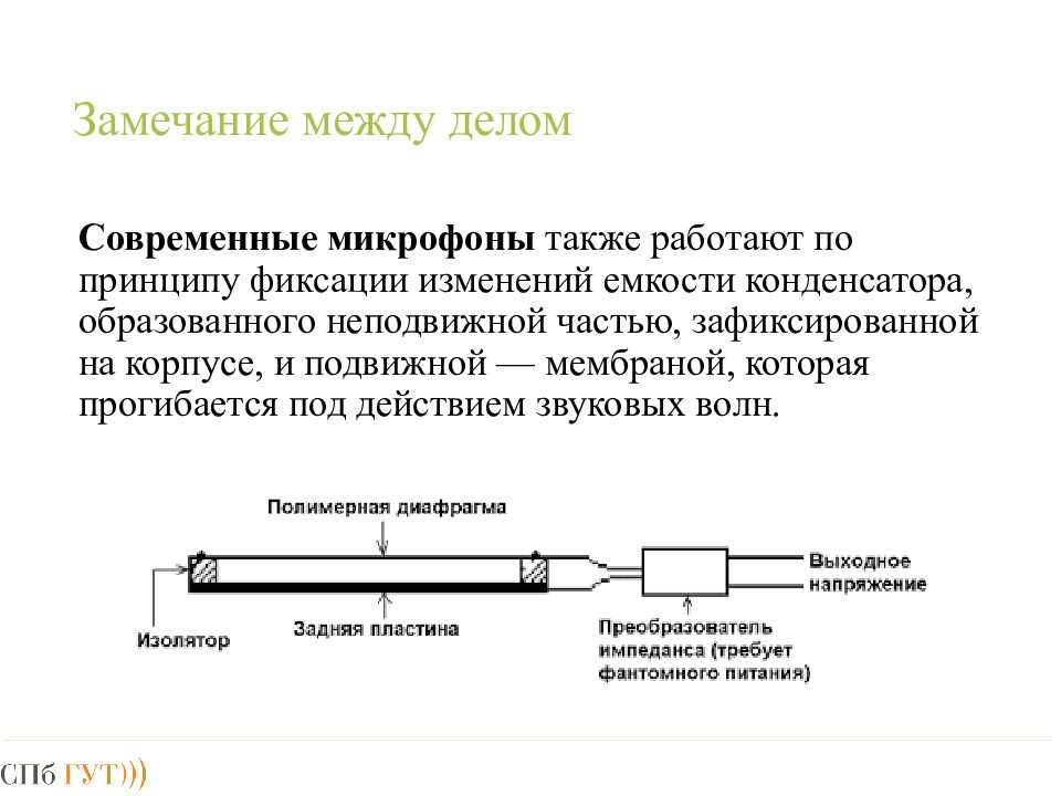 Современные микрофоны также работают по принципу фиксации изменений емкости конденсатора, образованного неподвижной частью, зафиксированной на корпусе, и подвижной — мембраной, которая прогибается под действием звуковых волн.