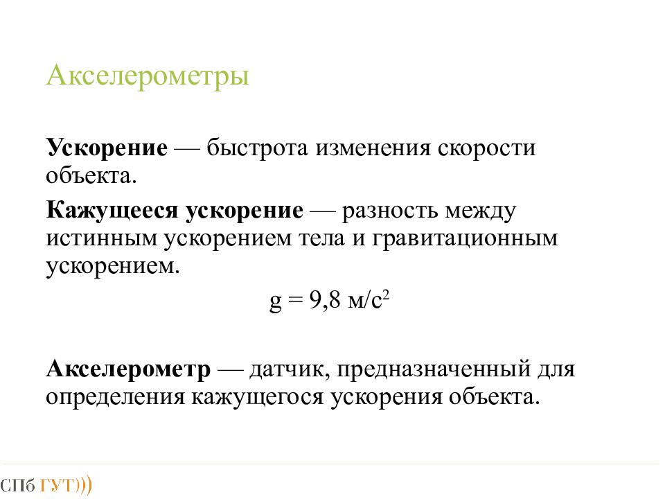 Ускорение — быстрота изменения скорости объекта. Кажущееся ускорение — разность между истинным ускорением тела и гравитационным ускорением. g = 9,8 м/с 2 Акселерометр — датчик, предназначенный для определения кажущегося ускорения объекта.
