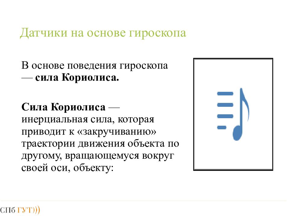 В основе поведения гироскопа — сила Кориолиса. Сила Кориолиса — инерциальная сила, которая приводит к «закручиванию» траектории движения объекта по другому, вращающемуся вокруг своей оси, объекту: