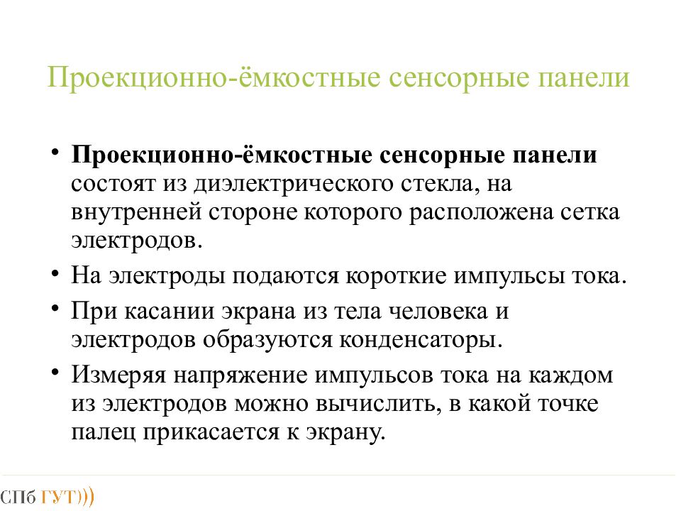 Проекционно-ёмкостные сенсорные панели состоят из диэлектрического стекла, на внутренней стороне которого расположена сетка электродов. На электроды подаются короткие импульсы тока. При касании экрана из тела человека и электродов образуются конденсаторы. Измеряя напряжение импульсов тока на каждом из электродов можно вычислить, в какой точке палец прикасается к экрану.