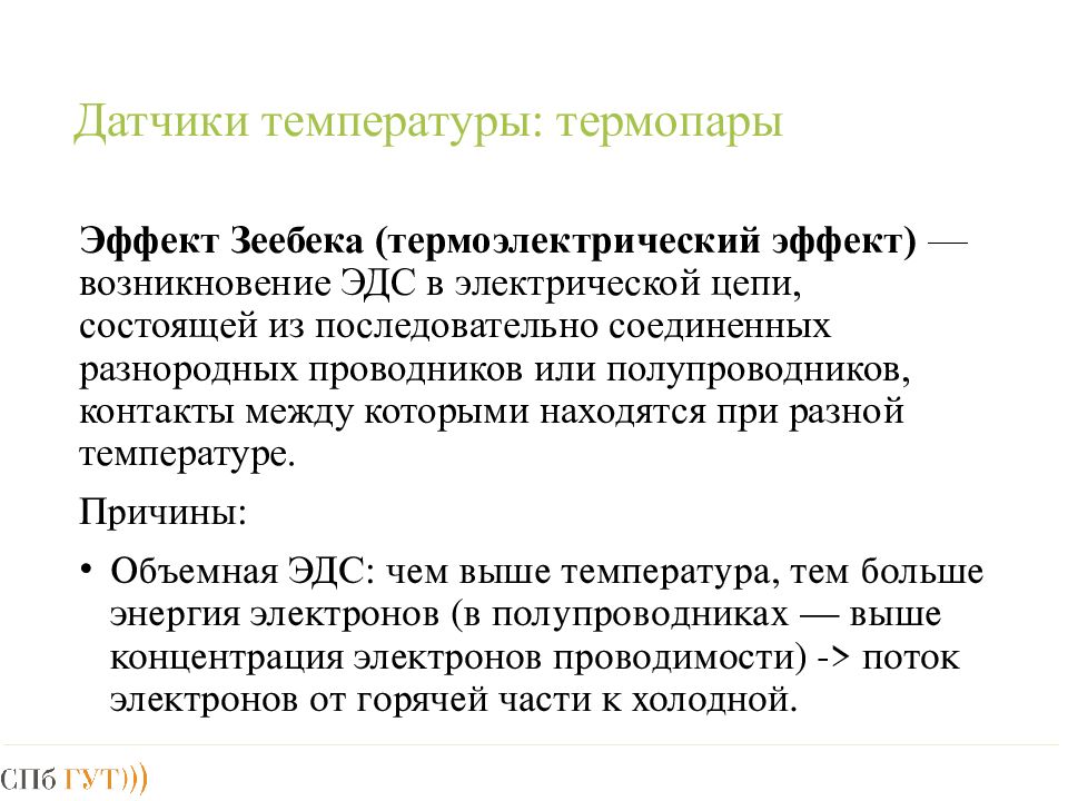Эффект Зеебека (термоэлектрический эффект) — возникновение ЭДС в электрической цепи, состоящей из последовательно соединенных разнородных проводников или полупроводников, контакты между которыми находятся при разной температуре. Причины: Объемная ЭДС: чем выше температура, тем больше энергия электронов (в полупроводниках — выше концентрация электронов проводимости) -> поток электронов от горячей части к холодной.