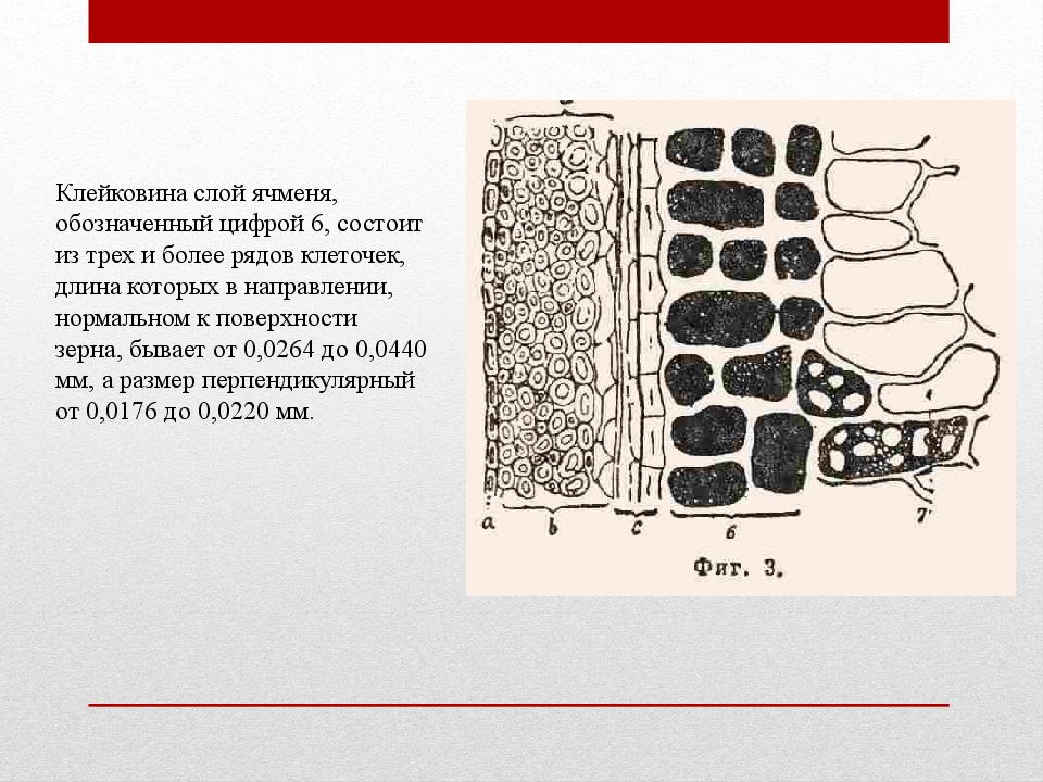 Клейковина слой ячменя, обозначенный цифрой 6, состоит из трех и более рядов клеточек, длина которых в направлении, нормальном к поверхности зерна, бывает от 0,0264 до 0,0440 мм, а размер перпендикулярный от 0,0176 до 0,0220 мм.