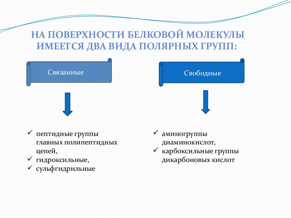 На поверхности белковой молекулы имеется два вида полярных групп: Свободные Связанные пептидные группы главных полипептидных цепей, гидроксильные, сульфгидрильные аминогруппы диаминокислот, карбоксильные группы дикарбоновых кислот