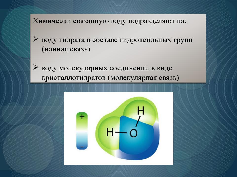 Химически связанную воду подразделяют на: воду гидрата в составе гидроксильных групп (ионная связь) воду молекулярных соединений в виде кристаллогидратов (молекулярная связь)