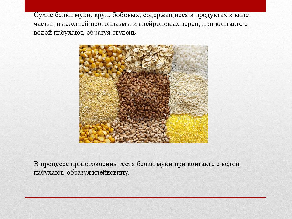 Сухие белки муки, круп, бобовых, содержащиеся в продуктах в виде частиц высохшей протоплазмы и алейроновых зерен, при контакте с водой набухают, образуя студень. В процессе приготовлени я теста белки муки при контакте с водой набухают, образуя клейковину.