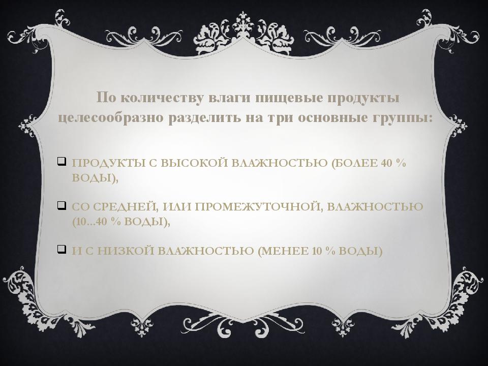 По количеству влаги пищевые продукты целесообразно разделить на три основные группы: продукты с высокой влажностью (более 40 % воды), со средней, или промежуточной, влажностью (10...40 % воды), и с низкой влажностью (менее 10 % воды)