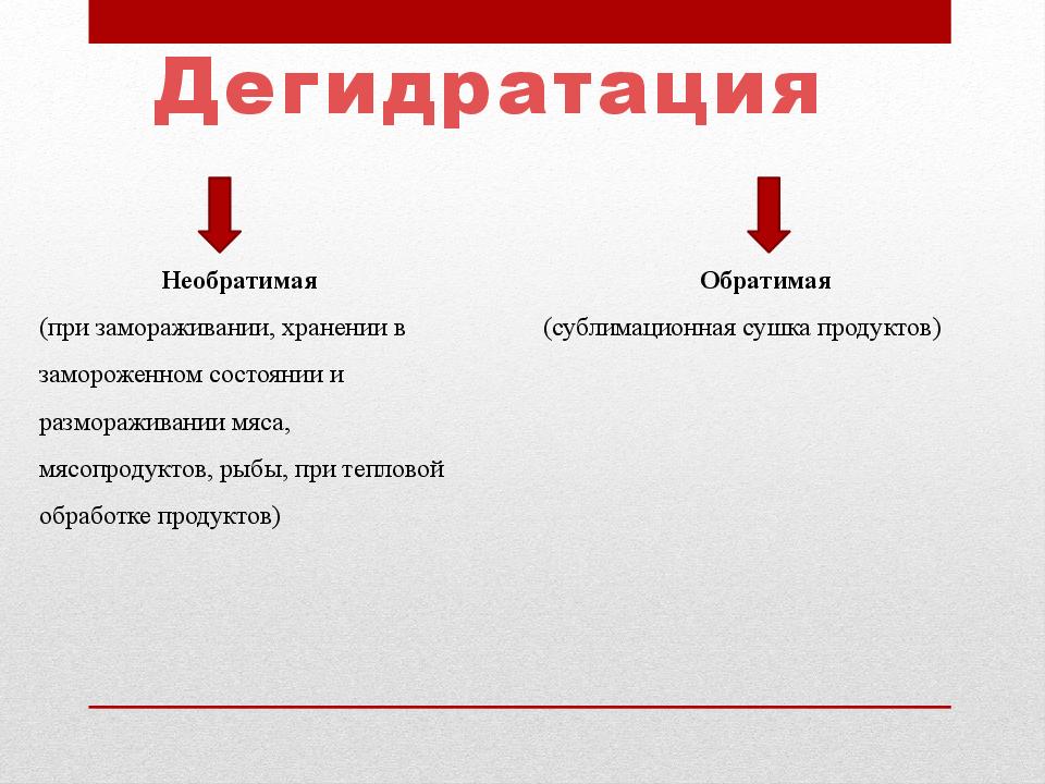 Необратимая (при замораживании, хранении в замороженном состоянии и размораживании мяса, мясопродуктов, рыбы, при тепловой обработке продуктов) Дегидратация Обратимая (сублимационная сушка продуктов)