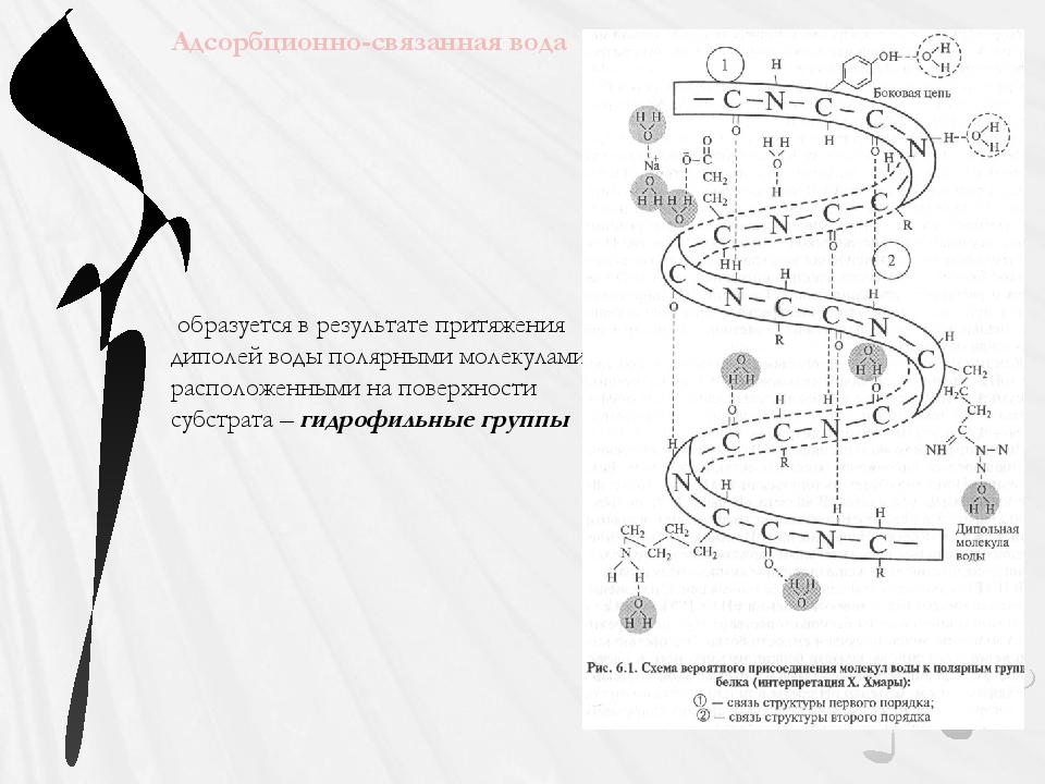 Адсорбционно-связанная вода образуется в результате притяжения диполей воды полярными молекулами, расположенными на поверхности субстрата – гидрофильные группы