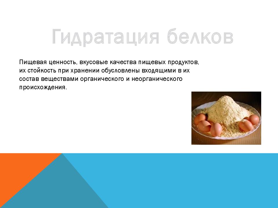 Гидратация белков Пищевая ценность, вкусовые качества пищевых продуктов, их стойкость при хранении обусловлены входящими в их состав веществами органического и неорганического происхождения.
