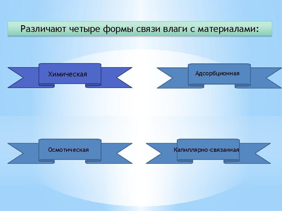 Различают четыре формы связи влаги с материалами: Химическая Адсорбционная Осмотическая Капиллярно-связанная