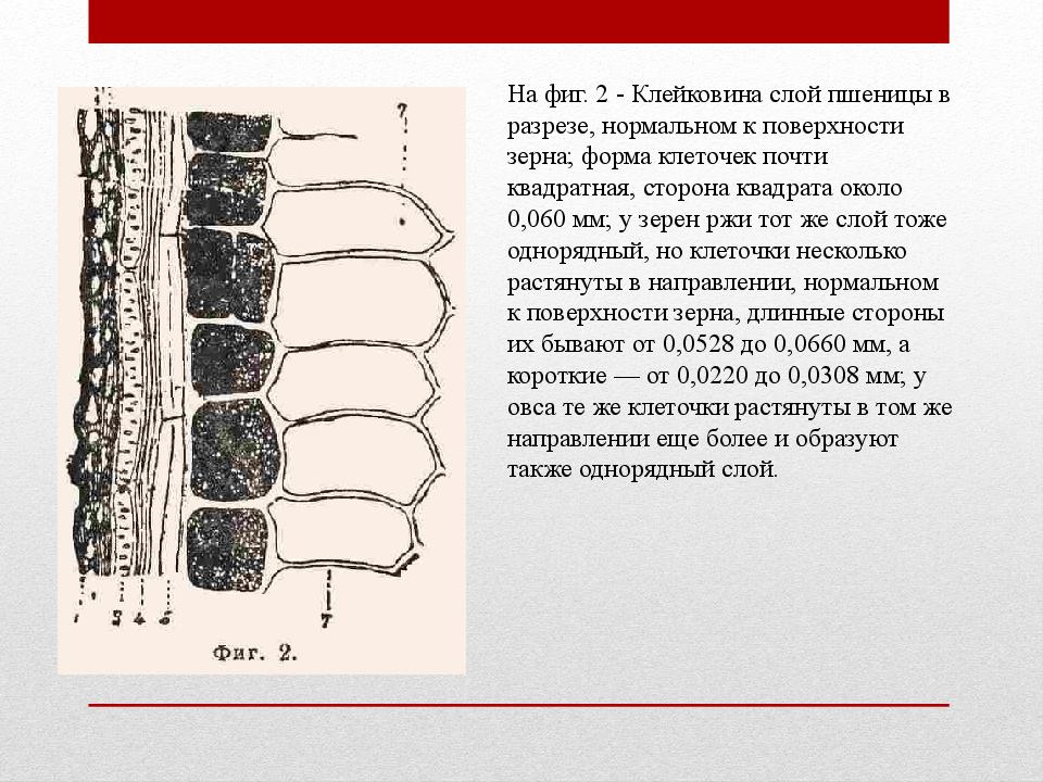 На фиг. 2 - Клейковина слой пшеницы в разрезе, нормальном к поверхности зерна; форма клеточек почти квадратная, сторона квадрата около 0,060 мм; у зерен ржи тот же слой тоже однорядный, но клеточки несколько растянуты в направлении, нормальном к поверхности зерна, длинные стороны их бывают от 0,0528 до 0,0660 мм, а короткие — от 0,0220 до 0,0308 мм; у овса те же клеточки растянуты в том же направлении еще более и образуют также однорядный слой.