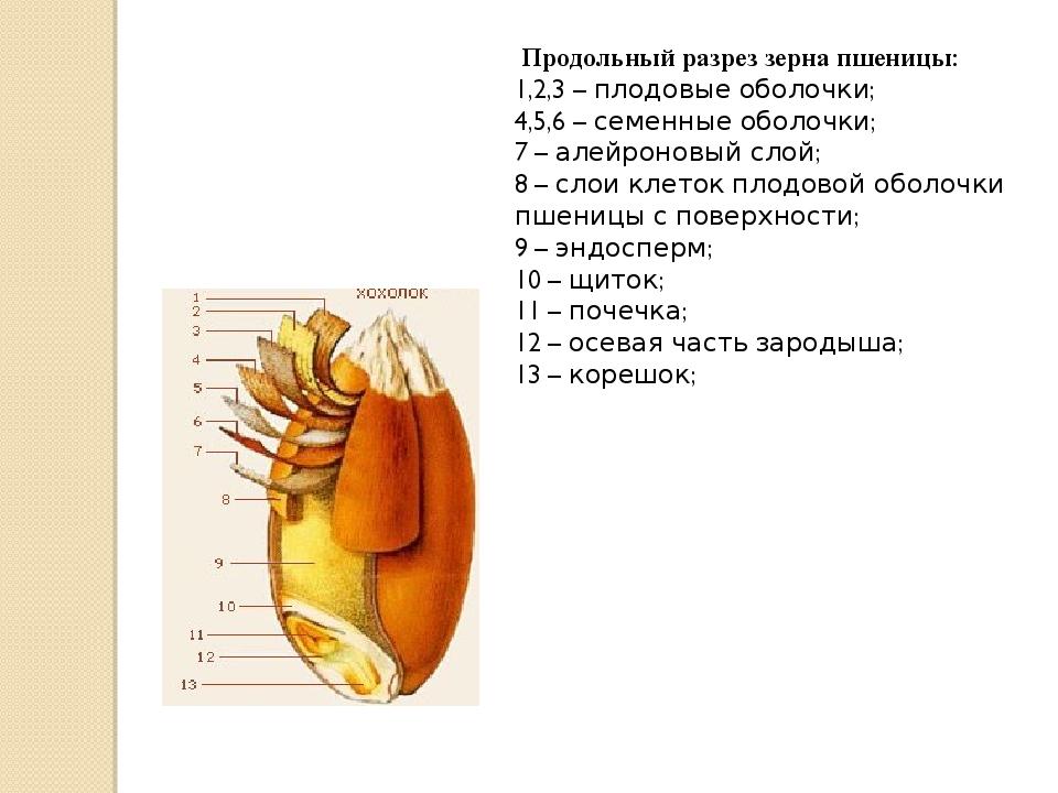 Продольный разрез зерна пшеницы: 1,2,3 – плодовые оболочки; 4,5,6 – семенные оболочки; 7 – алейроновый слой; 8 – слои клеток плодовой оболочки пшеницы с поверхности; 9 – эндосперм; 10 – щиток; 11 – почечка ; 12 – осевая часть зародыша; 13 – корешок;