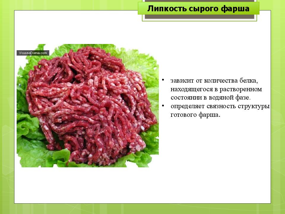 зависит от количества белка, находящегося в растворенном состоянии в водяной фазе. определяет связность структуры готового фарша. Липкость сырого фарша