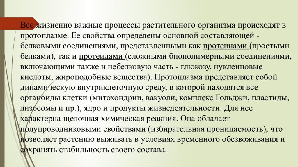 Все жизненно важные процессы растительного организма происходят в протоплазме. Ее свойства определены основной составляющей - белковыми соединениями, представленными как протеинами (простыми белками), так и протеидами (сложными биополимерными соединениями, включающими также и небелковую часть - глюкозу, нуклеиновые кислоты, жироподобные вещества). Протоплазма представляет собой динамическую внутриклеточную среду, в которой находятся все органоиды клетки (митохондрии, вакуоли, комплекс Гольджи, пластиды, лизосомы и пр.), ядро и продукты жизнедеятельности. Для нее характерна щелочная химическая реакция. О на обладает полупроводниковыми свойствами (избирательная проницаемость), что позволяет растению выживать в условиях временного обезвоживания и сохранять стабильность своего состава.