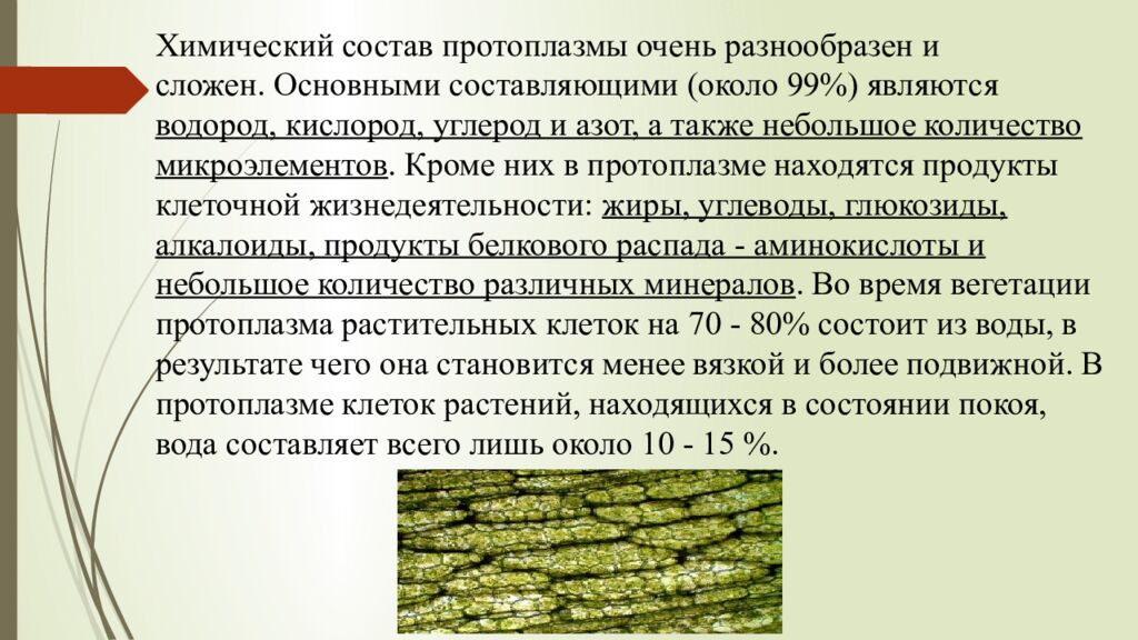 Химический состав протоплазмы очень разнообразен и сложен. Основными составляющими (около 99%) являются водород, кислород, углерод и азот, а также небольшое количество микроэлементов. Кроме них в протоплазме находятся продукты клеточной жизнедеятельности: жиры, углеводы, глюкозиды, алкалоиды, продукты белкового распада - аминокислоты и небольшое количество различных минералов. Во время вегетации протоплазма растительных клеток на 70 - 80% состоит из воды, в результате чего она становится менее вязкой и более подвижной. В протоплазме клеток растений, находящихся в состоянии покоя, вода составляет всего лишь около 10 - 15 %.
