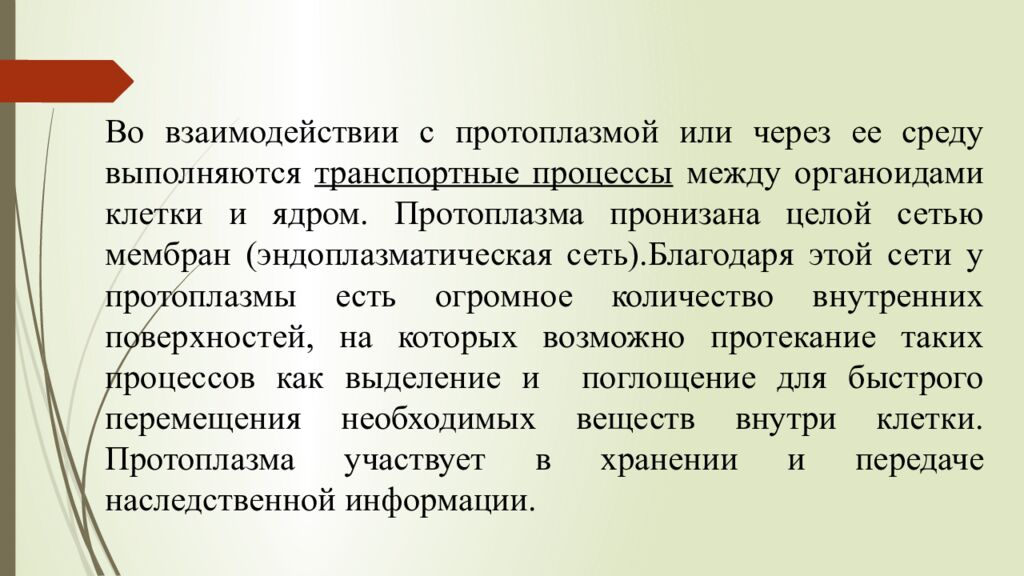Во взаимодействии с протоплазмой или через ее среду выполняются транспортные процессы между органоидами клетки и ядром. Протоплазма пронизана целой сетью мембран (эндоплазматическая сеть).Благодаря этой сети у протоплазмы есть огромное количество внутренних поверхностей, на которых возможно протекание таких процессов как выделение и поглощение для быстрого перемещения необходимых веществ внутри клетки. П ротоплазма участвует в хранении и передаче наследственной информации.