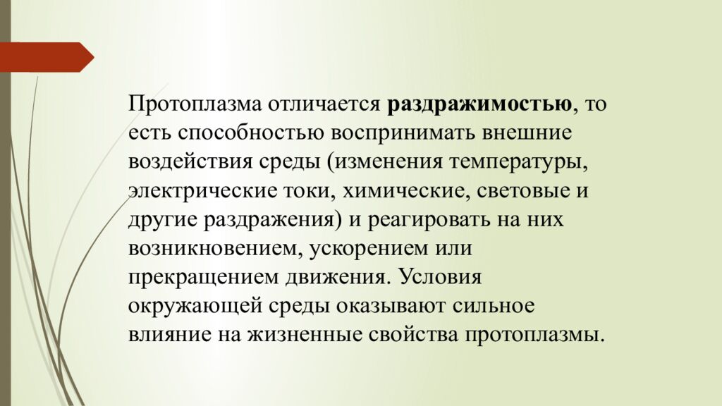 Протоплазма отличается раздражимостью, то есть способностью воспринимать внешние воздействия среды (изменения температуры, электрические токи, химические, световые и другие раздражения) и реагировать на них возникновением, ускорением или прекращением движения. Условия окружающей среды оказывают сильное влияние на жизненные свойства протоплазмы.