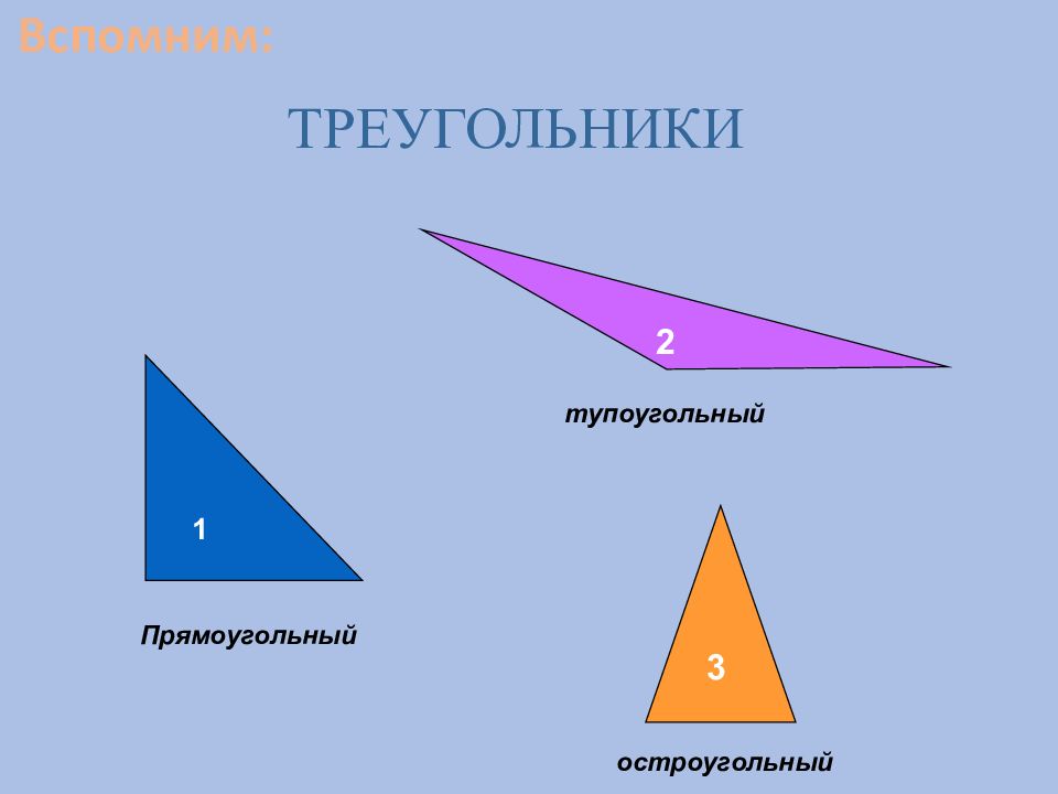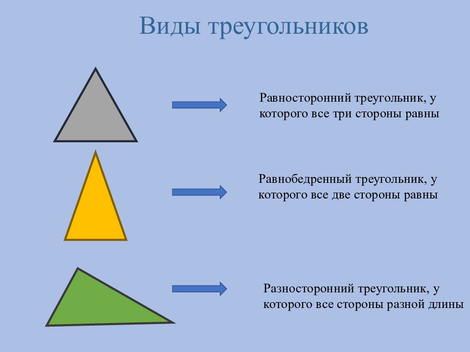 Виды треугольников Равносторонний треугольник, у которого все три стороны равны Равнобедренный треугольник, у которого все две стороны равны Разносторонний треугольник, у которого все стороны разной длины