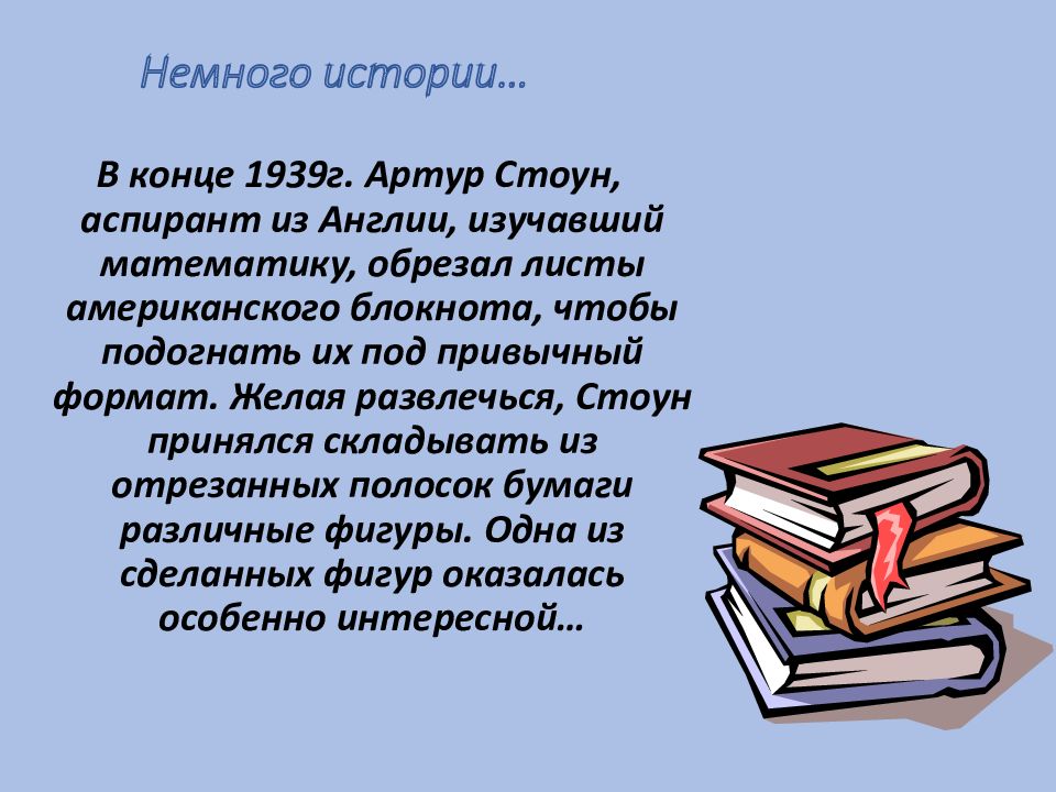 В конце 1939г. Артур Стоун, аспирант из Англии, изучавший математику, обрезал листы американского блокнота, чтобы подогнать их под привычный формат. Желая развлечься, Стоун принялся складывать из отрезанных полосок бумаги различные фигуры. Одна из сделанных фигур оказалась особенно интересной…