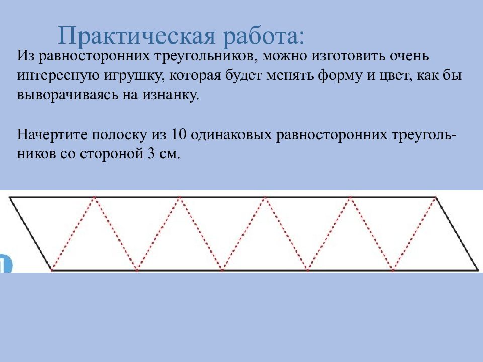 Практическая работа: Из равносторонних треугольников, можно изготовить очень интересную игрушку, которая будет менять форму и цвет, как бы выворачиваясь на изнанку. Начертите полоску из 10 одинаковых равносторонних треуголь - ников со стороной 3 см.