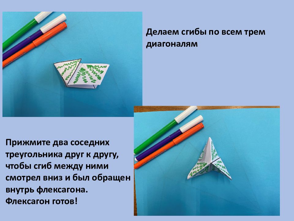 Делаем сгибы по всем трем диагоналям Прижмите два соседних треугольника друг к другу, чтобы сгиб между ними смотрел вниз и был обращен внутрь флексагона. Флексагон готов!