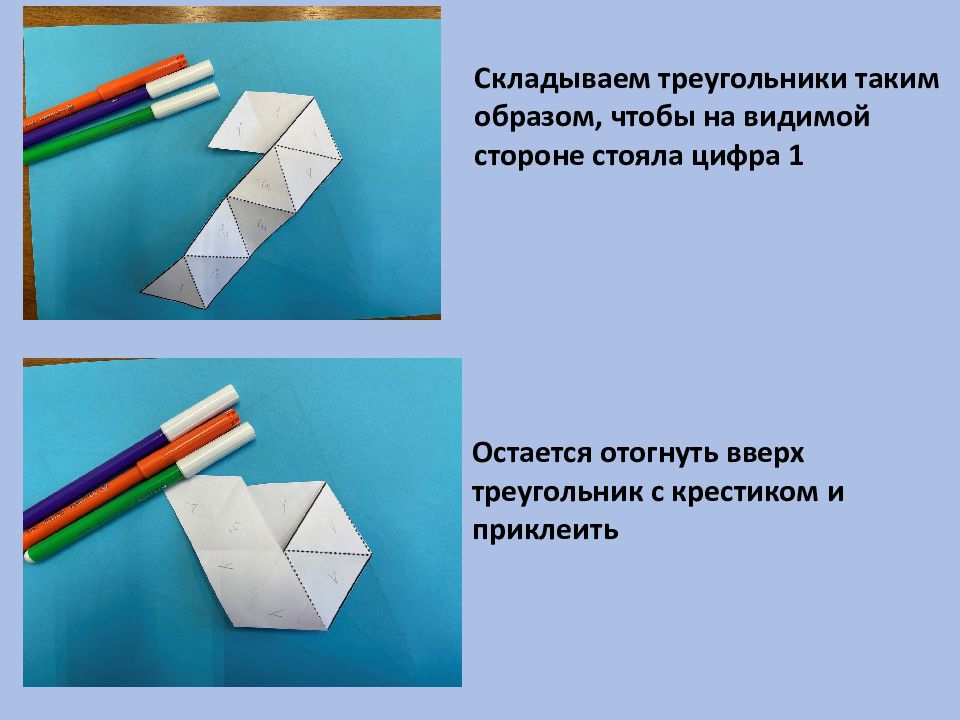 Складываем треугольники таким образом, чтобы на видимой стороне стояла цифра 1 Остается отогнуть вверх треугольник с крестиком и приклеить