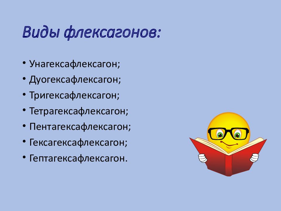 Унагексафлексагон; Дуогексафлексагон ; Тригексафлексагон ; Тетрагексафлексагон ; Пентагексафлексагон ; Гексагексафлексагон ; Гептагексафлексагон.