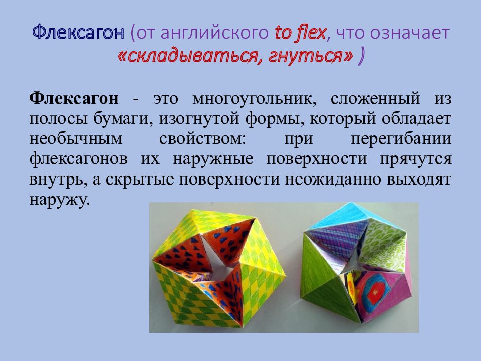 Флексагон - это многоугольник, сложенный из полосы бумаги, изогнутой формы, который обладает необычным свойством: при перегибании флексагонов их наружные поверхности прячутся внутрь, а скрытые поверхности неожиданно выходят наружу.