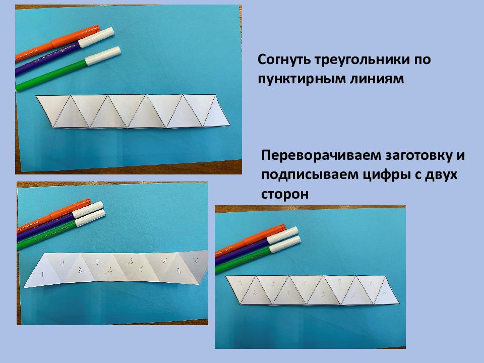 Согнуть треугольники по пунктирным линиям Переворачиваем заготовку и подписываем цифры с двух сторон