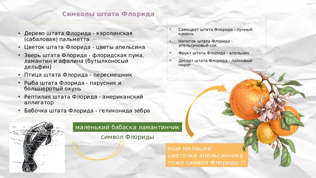 Дерево штата Флорида - каролинская ( сабаловая ) пальметта Цветок штата Флорида - цветы апельсина Зверь штата Флорида - флоридская пума, ламантин и афалина ( бутылконосый дельфин) Птица штата Флорида - пересмешник Рыба штата Флорида - парусник и большеротый окунь Рептилия штата Флорида - американский аллигатор Бабочка штата Флорида - геликонида зебра Самоцвет штата Флорида - лунный камень Напиток штата Флорида - апельсиновый сок Фрукт штата Флорида - апельсин Десерт штата Флорида - лаймовый пирог м аленький бабаска ламантинчик с имвол Флориды е ще милашки цветочки апельсинчика тоже символ Флориды !!
