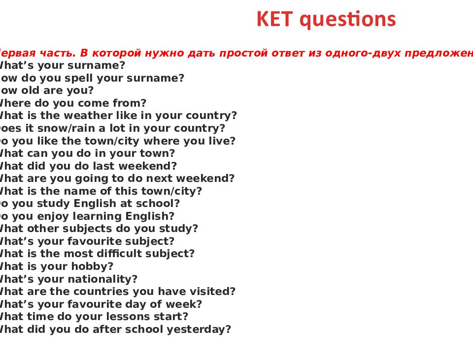 Первая часть. В которой нужно дать простой ответ из одного-двух предложений What’s your surname ? How do you spell your surname ? How old are you ? Where do you come from ? What is the weather like in your country ? Does it snow / rain a lot in your country ? Do you like the town / city where you live ? What can you do in your town ? What did you do last weekend ? What are you going to do next weekend ? What is the name of this town / city ? Do you study English at school ? Do you enjoy learning English ? What other subjects do you study ? What’s your favourite subject ? What is the most difficult subject ? What is your hobby ? What’s your nationality ? What are the countries you have visited ? What’s your favourite day of week ? What time do your lessons start ? What did you do after school yesterday ? KET questions