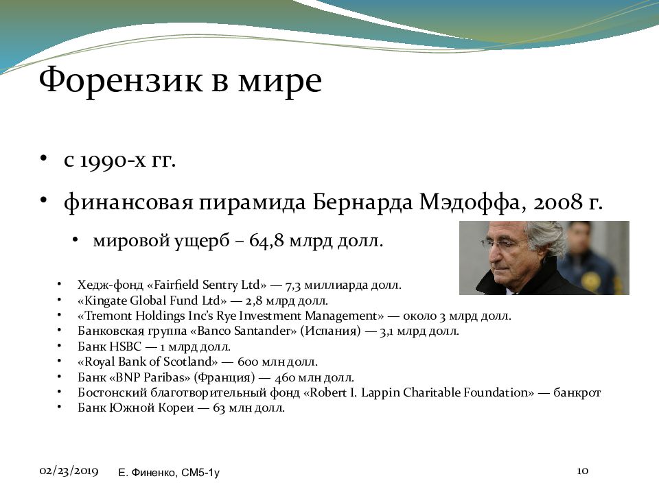 с 1990-х гг. финансовая пирамида Бернарда Мэдоффа, 2008 г. мировой ущерб – 64,8 млрд долл. 16.02.2019 10 Е. Финенко, СМ5-1у Хедж-фонд « Fairfield Sentry Ltd» — 7,3 миллиарда долл. « Kingate Global Fund Ltd» — 2,8 млрд долл. « Tremont Holdings Inc’s Rye Investment Management» — около 3 млрд долл. Банковская группа « Banco Santander» ( Испания) — 3,1 млрд долл. Банк HSBC — 1 млрд долл. « Royal Bank of Scotland» — 600 млн долл. Банк « BNP Paribas» ( Франция) — 460 млн долл. Бостонский благотворительный фонд « Robert I. Lappin Charitable Foundation» — банкрот Банк Южной Кореи — 63 млн долл.
