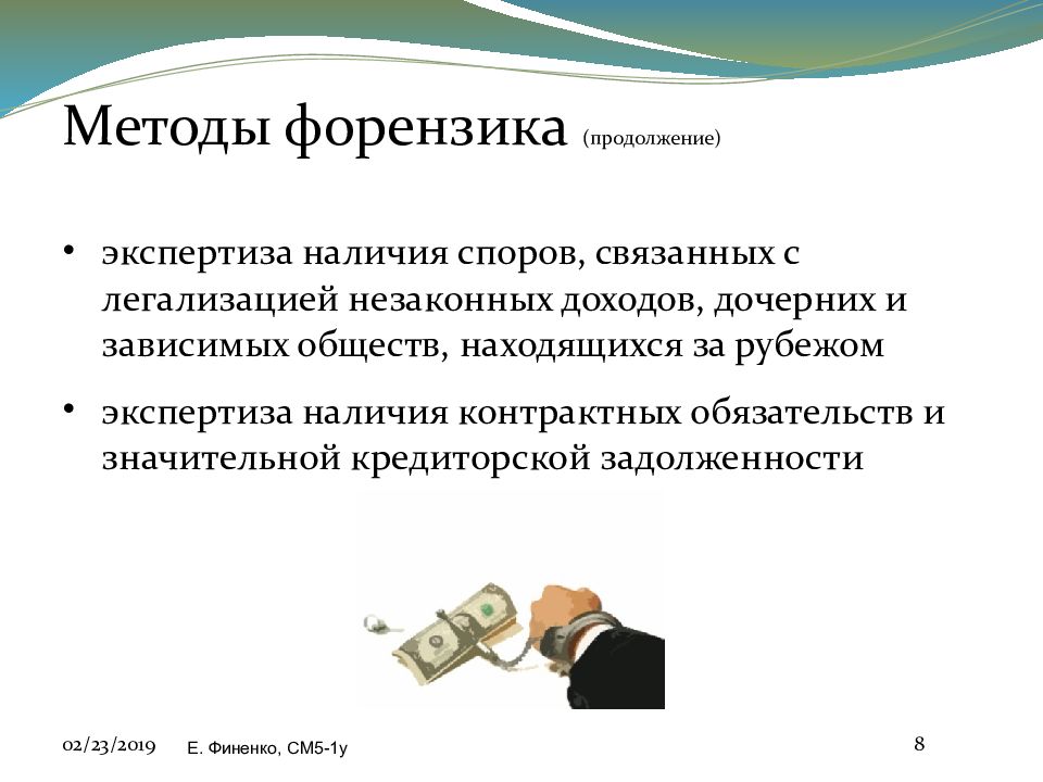 экспертиза наличия споров, связанных с легализацией незаконных доходов, дочерних и зависимых обществ, находящихся за рубежом экспертиза наличия контрактных обязательств и значительной кредиторской задолженности 16.02.2019 8 Е. Финенко, СМ5-1у