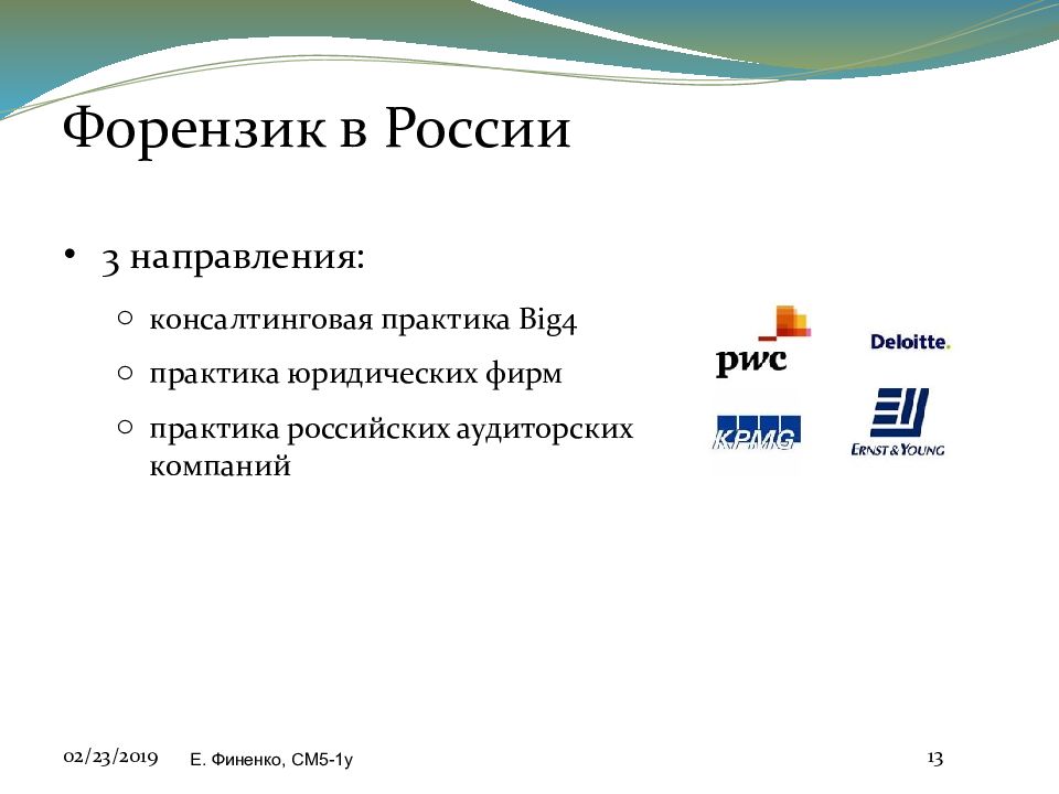 3 направления: консалтинговая практика Big4 практика юридических фирм практика российских аудиторских компаний 16.02.2019 13 Е. Финенко, СМ5-1у