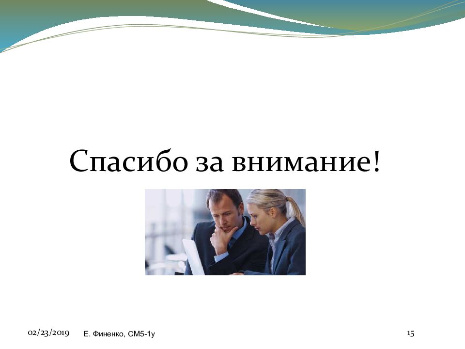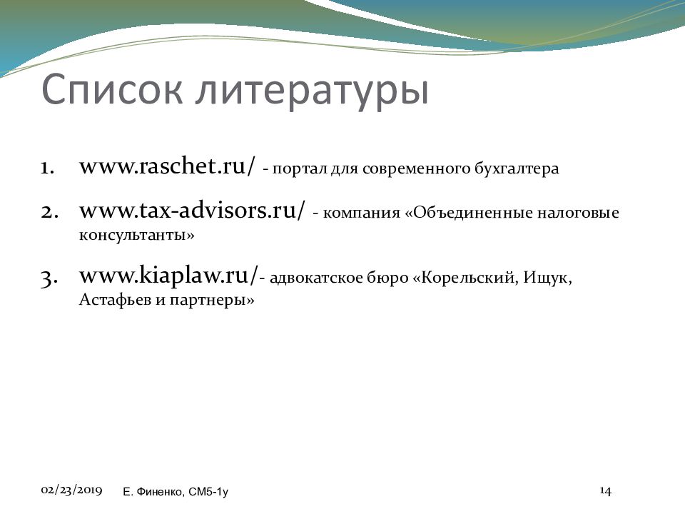 www.raschet.ru/ - портал для современного бухгалтера www.tax-advisors.ru/ - компания «Объединенные налоговые консультанты» www.kiaplaw.ru/ - адвокатское бюро «Корельский, Ищук, Астафьев и партнеры» 16.02.2019 14 Е. Финенко, СМ5-1у