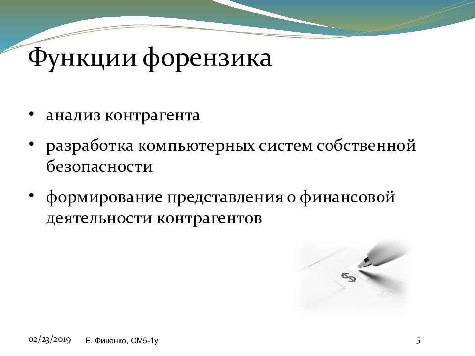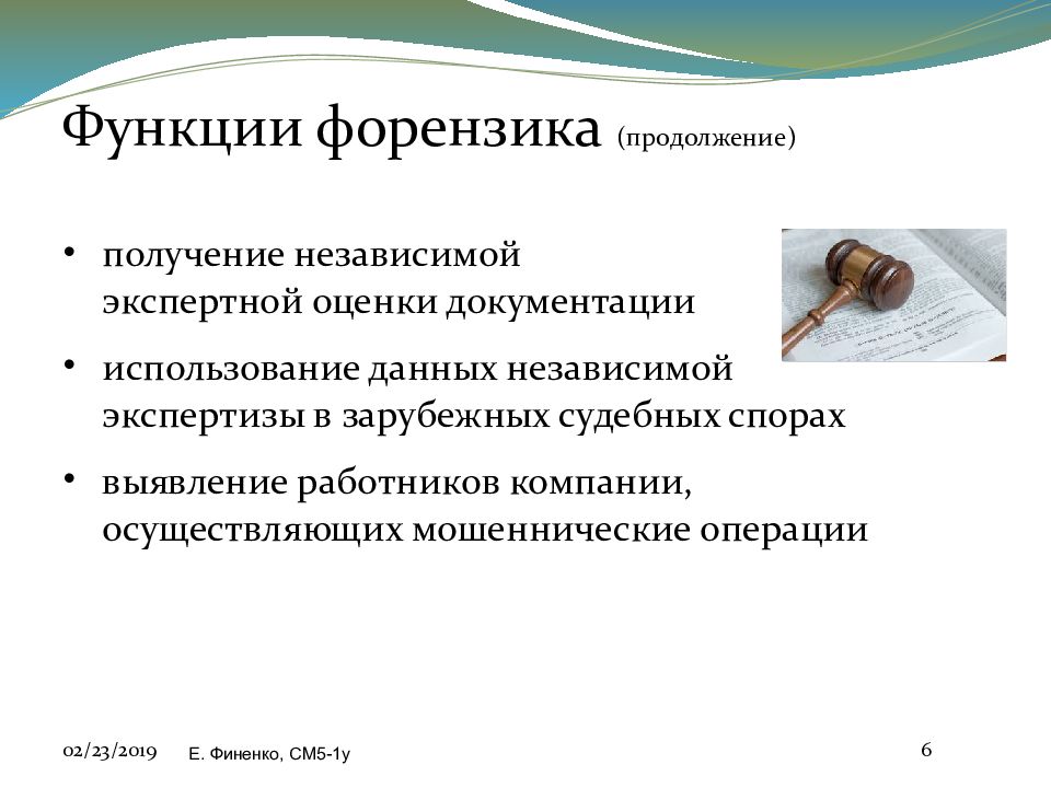 получение независимой экспертной оценки документации использование данных независимой экспертизы в зарубежных судебных спорах выявление работников компании, осуществляющих мошеннические операции 16.02.2019 6 Е. Финенко, СМ5-1у
