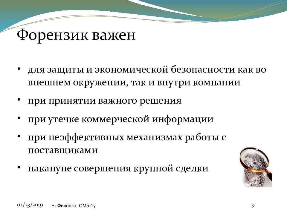 для защиты и экономической безопасности как во внешнем окружении, так и внутри компании при принятии важного решения при утечке коммерческой информации при неэффективных механизмах работы с поставщиками накануне совершения крупной сделки 16.02.2019 9 Е. Финенко, СМ5-1у