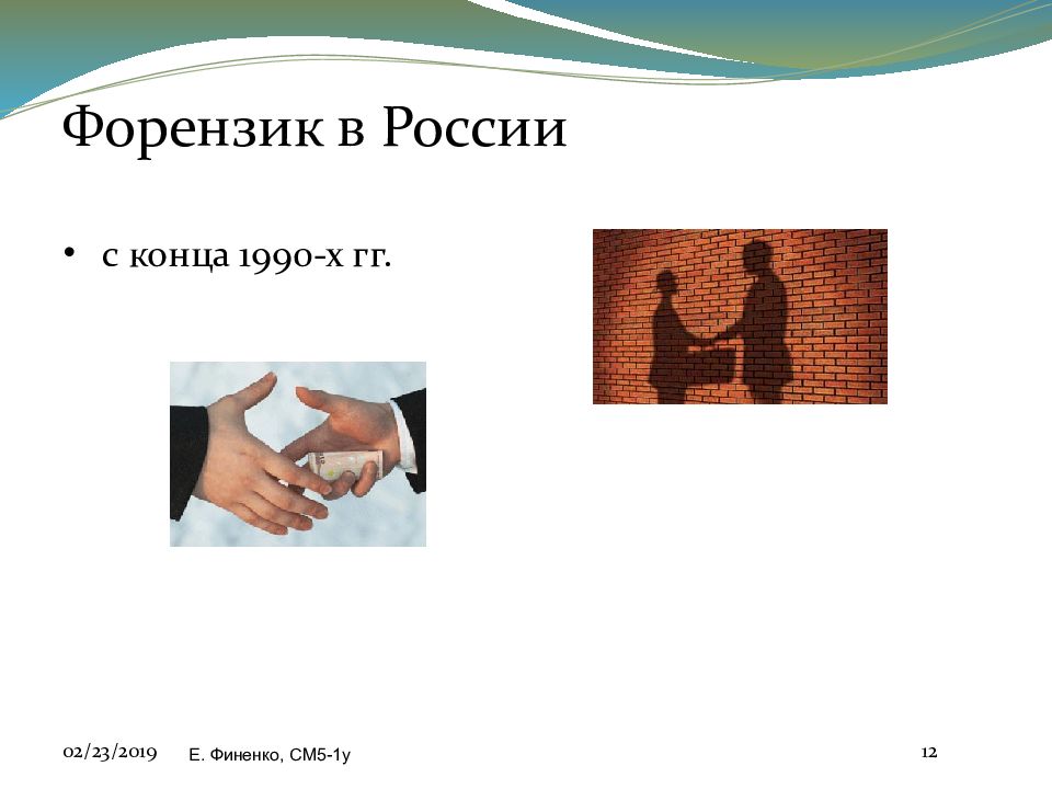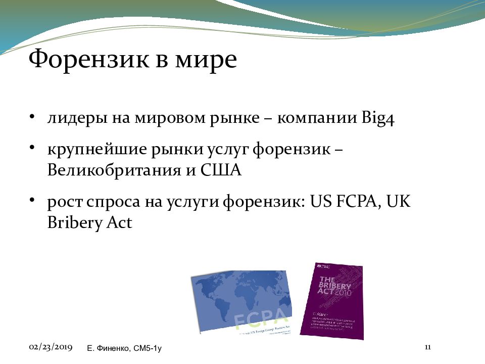 лидеры на мировом рынке – компании Big4 крупнейшие рынки услуг форензик – Великобритания и США рост спроса на услуги форензик: US FCPA, UK Bribery Act 16.02.2019 11 Е. Финенко, СМ5-1у