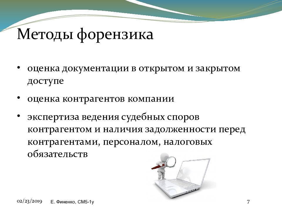 оценка документации в открытом и закрытом доступе оценка контрагентов компании экспертиза ведения судебных споров контрагентом и наличия задолженности перед контрагентами, персоналом, налоговых обязательств 16.02.2019 7 Е. Финенко, СМ5-1у