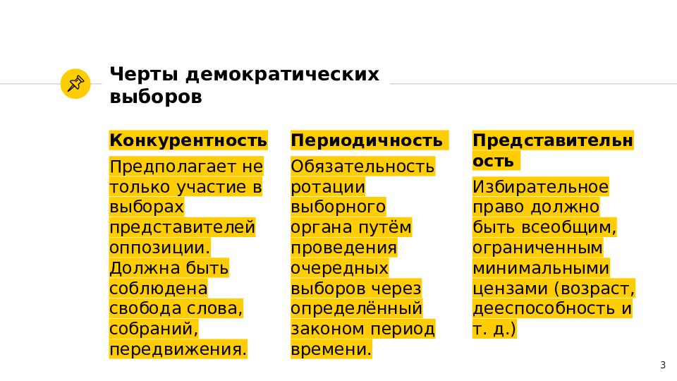 Конкурентность Предполагает не только участие в выборах представителей оппозиции. Должна быть соблюдена свобода слова, собраний, передвижения. Периодичность Обязательность ротации выборного органа путём проведения очередных выборов через определённый законом период времени. Представительность Избирательное право должно быть всеобщим, ограниченным минимальными цензами ( возраст, дееспособность и т. д.) 3