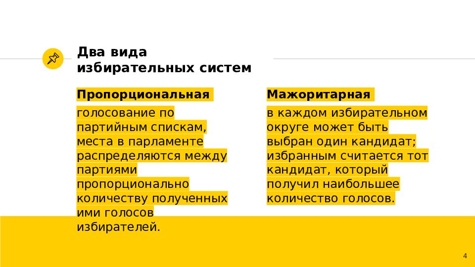 Пропорциональная голосование по партийным спискам, места в парламенте распределяются между партиями пропорционально количеству полученных ими голосов избирателей. Мажоритарная в каждом избирательном округе может быть выбран один кандидат; избранным считается тот кандидат, который получил наибольшее количество голосов. 4