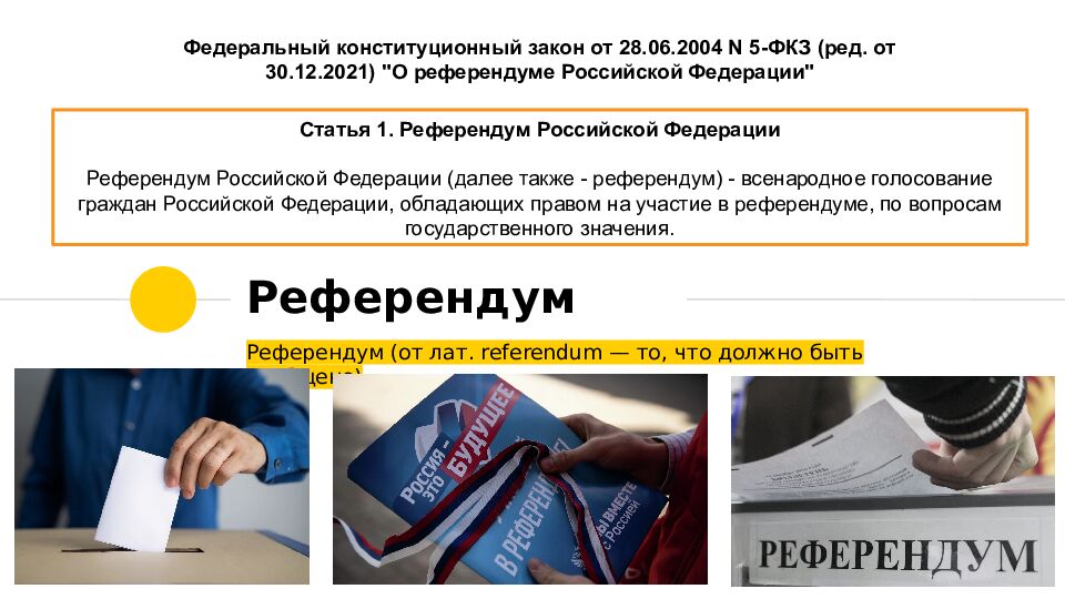 Референдум (от лат. referendum — то, что должно быть сообщено) 5 Статья 1. Референдум Российской Федерации Референдум Российской Федерации (далее также - референдум) - всенародное голосование граждан Российской Федерации, обладающих правом на участие в референдуме, по вопросам государственного значения. Федеральный конституционный закон от 28.06.2004 N 5-ФКЗ (ред. от 30.12.2021) "О референдуме Российской Федерации"